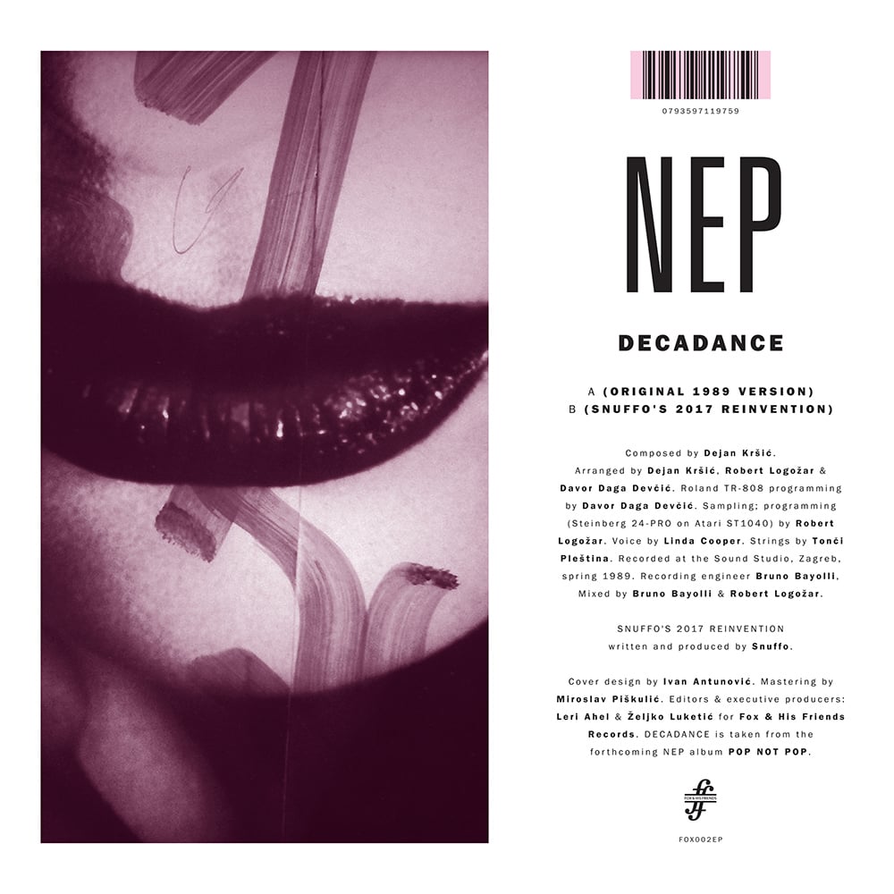 NEP was a loose multimedia collective formed in 1982 Zagreb, ex-Yugoslavia. The founder Dejan Krsic collaborated with various artists in a quest of re-thinking the stale concepts of art history, position of the author and the barriers between pop and elitist high culture. Heavily influenced by Walter Benjamin and Andy Warhol in theory and Brian Eno and Kraftwerk in music, Krsic created NEP as an umbrella term (meaning Nova Evropa) of diverse rule-breaking activities, covering graphic design, music, photography, video, news-media and theoretical work. Musically NEP focused on experiments in ambient and tape-music, mostly self-released or hard to find compilations like “The Cassette Played Poptones” (1988). Deeply immersed in pop-culture, politics and art theory Krsic’s search for perfect pop music with cutting critical edge peaked in 1989, the year Decadance track was conceived in studio, but has never been published.